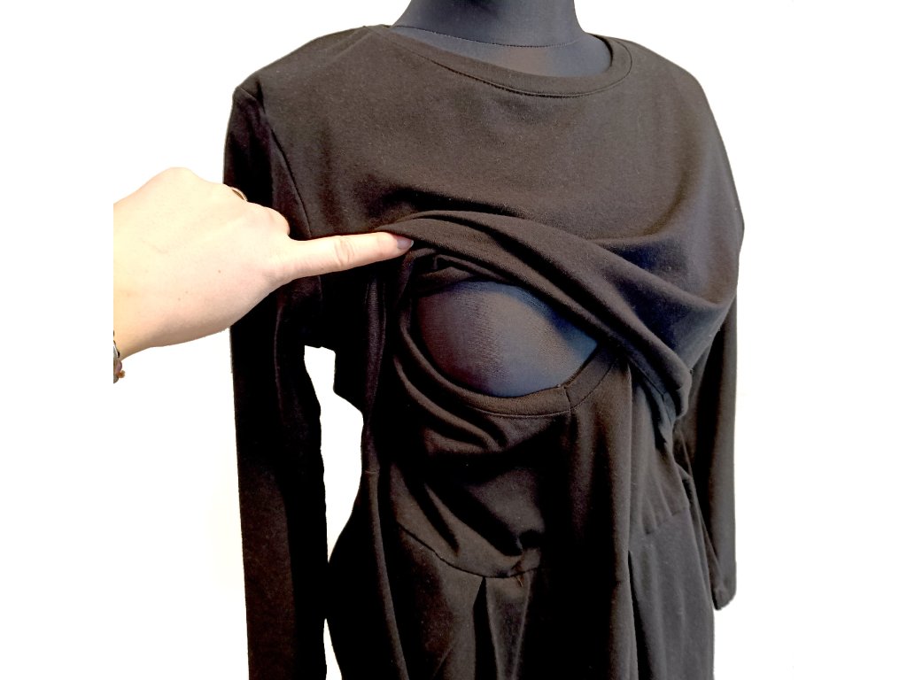 Zakrytý hluboký výstřih umožňuje snadné a přitom velmi diskrétní kojení kdekoliv a kdykoliv.
