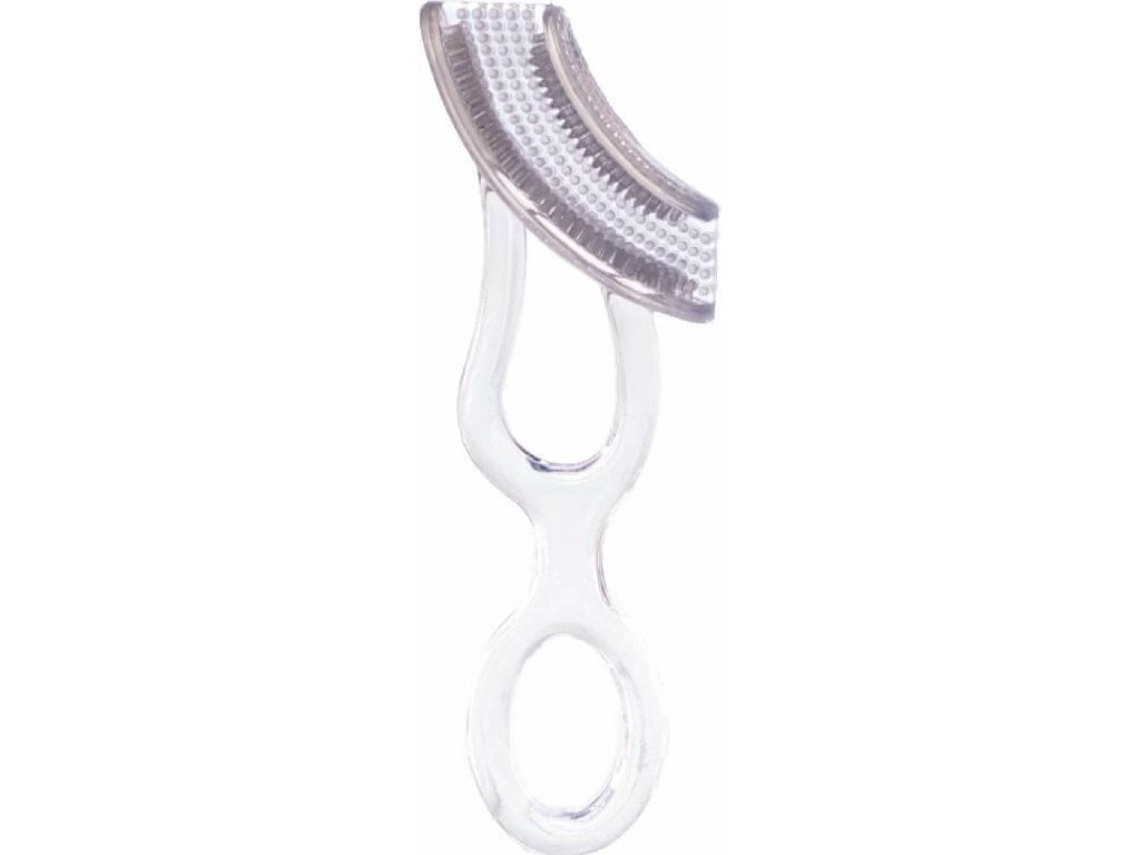 Kartáček je jemný k malým zoubkům a citlivým dásním díky jemným silikonovým štětinkám. Oboustranný kartáček na zuby a dásně čistí současně vrchní i spodní část, přední i zadní část ústní dutiny a to zároveň! Víme, že tento kartáček vypadá opravdu zvláštně, ale skutečně funguje. Jelikož "objímá" zuby, děti jej mohou používat zcela jednoduše samy. Vhodný pro děti od 2-6 let.